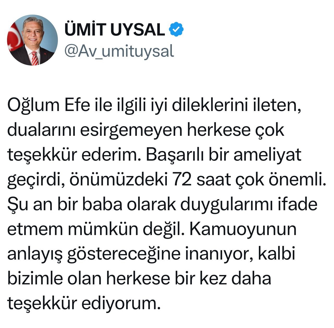 "Oğlum Efe ile ilgili iyi dileklerini ileten, dualarını esirgemeyen herkese çok teşekkür ederim. Başarılı bir ameliyat geçirdi, önümüzdeki 72 saat çok önemli. Şu an bir baba olarak duygularımı ifade etmem mümkün değil. Kamuoyunun anlayış göstereceğine inanıyor, kalbi bizimle olan herkese bir kez daha teşekkür ediyorum."