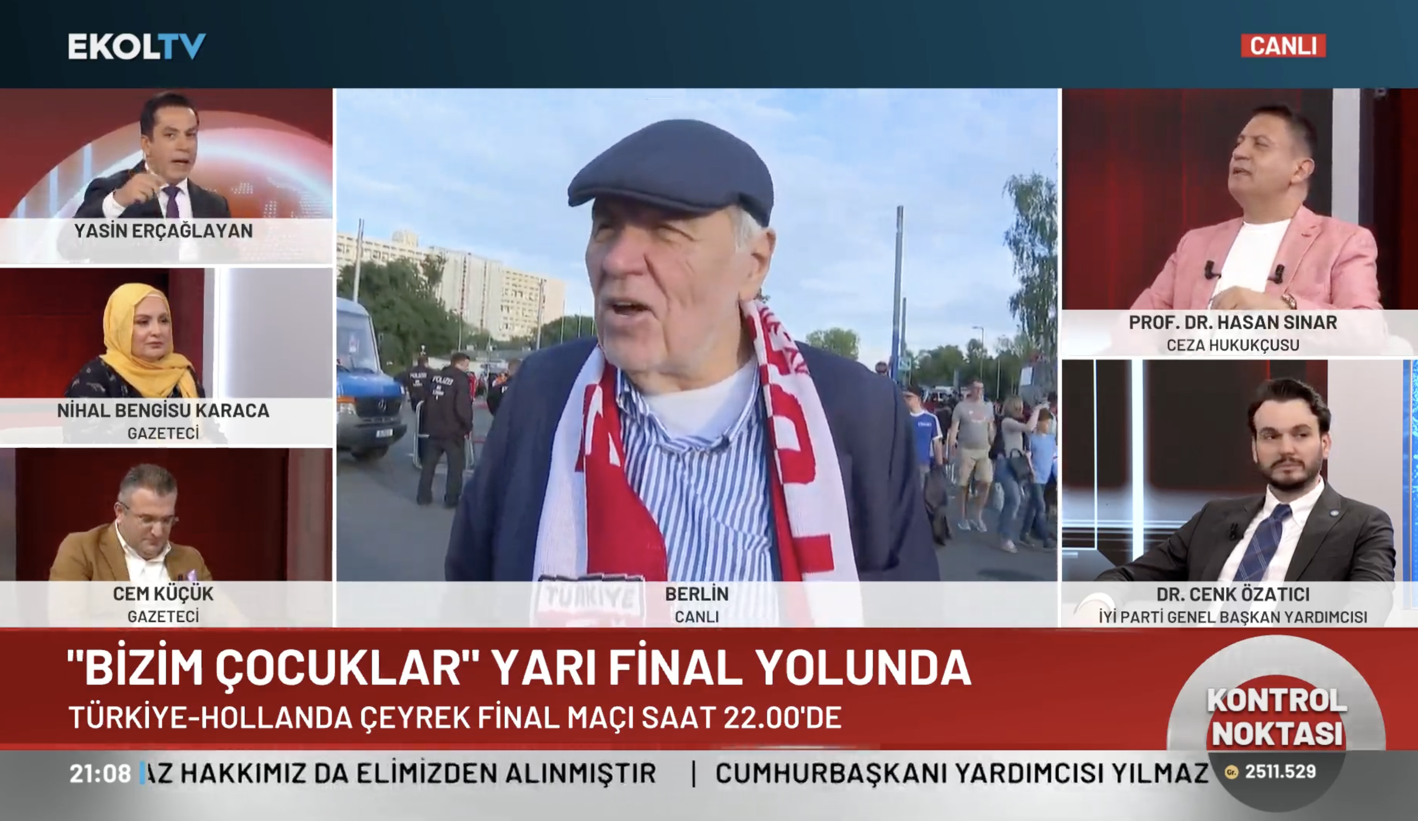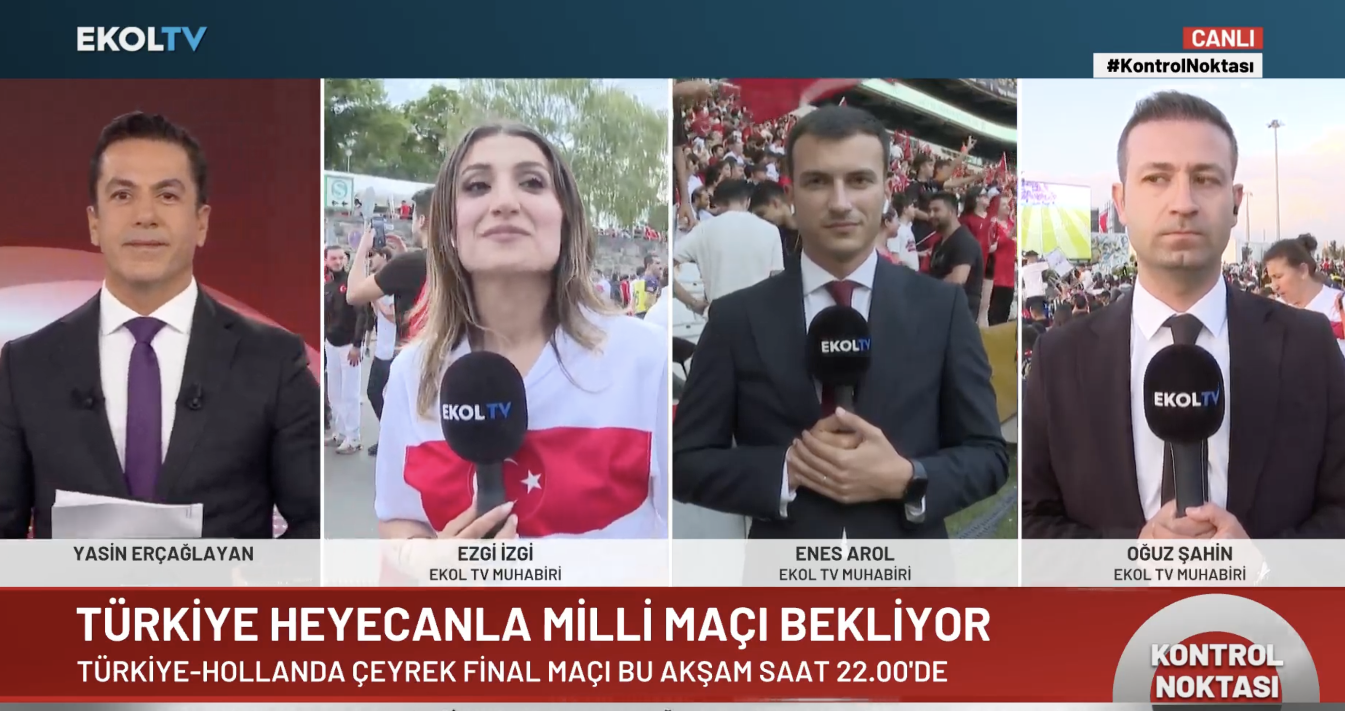 Türkiye Hollanda maçı öncesi Ekol TV muhabiri Ezgi İzgi Almanya'dan aktardı. Almanya'daki Türklerin heyecanını paylaşan İzgi, Alman polisinin küçük kortejler halinde yürümeleri konusunda uyardıklarını bazı taraftarların gözaltına alındığını duyurdu. UEFA'nın Merih Demiral kararına da taraftarların tepki gösterdiğini belirtti.